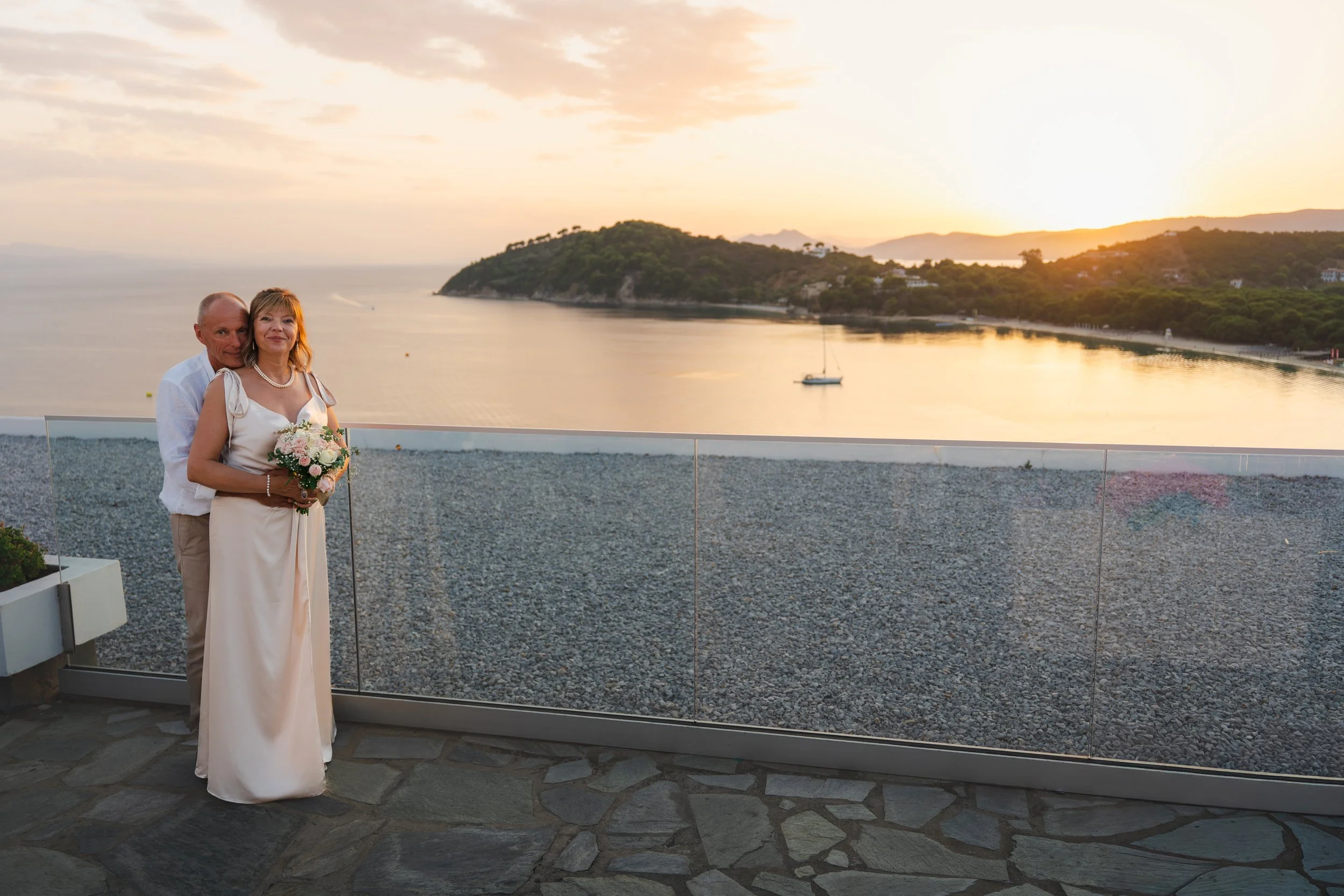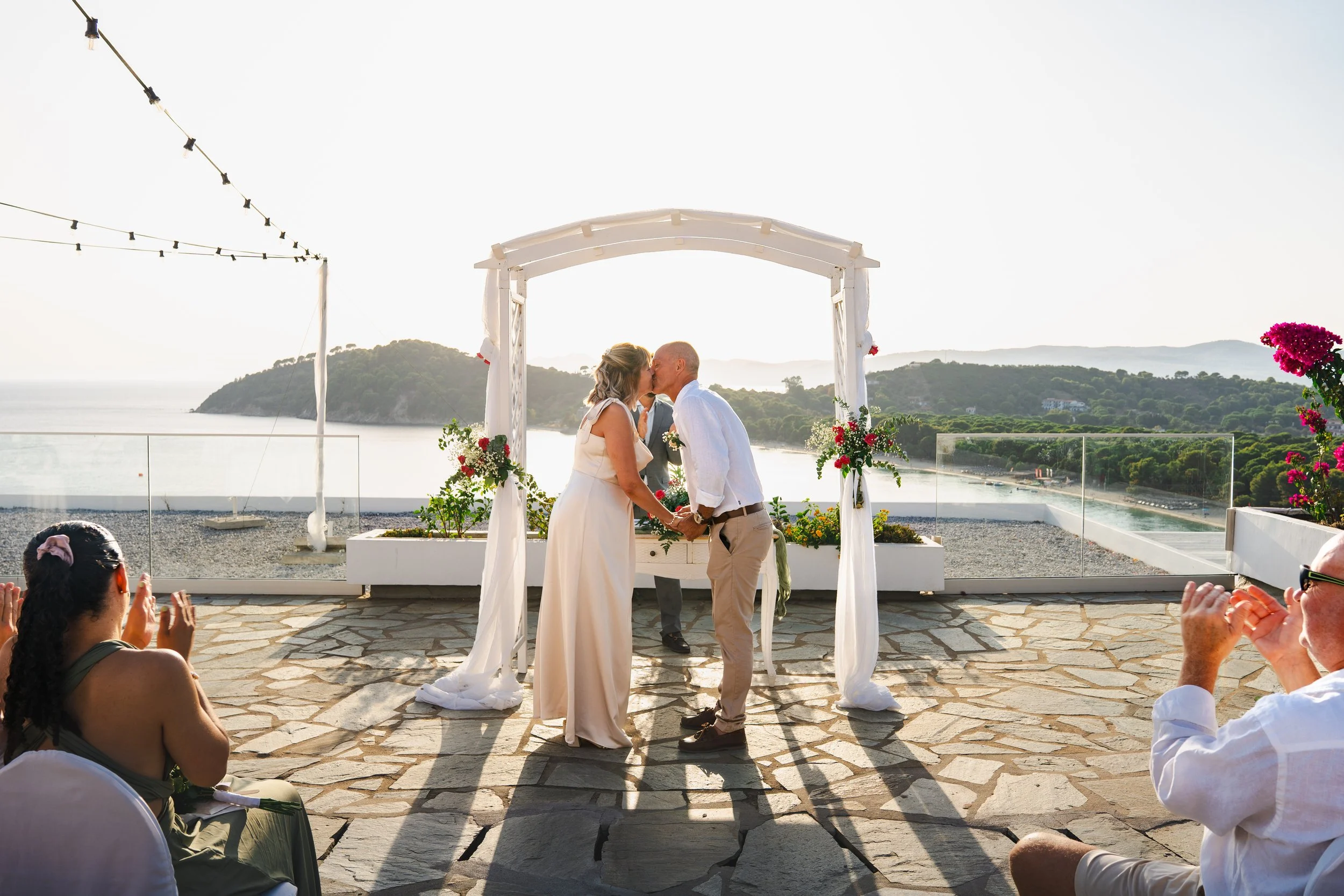 We fell in love with the beautiful Skiathos Palace Hotel in Koukounaries — a venue with panoramic views over the bay and the most romantic sunset backdrop imaginable.