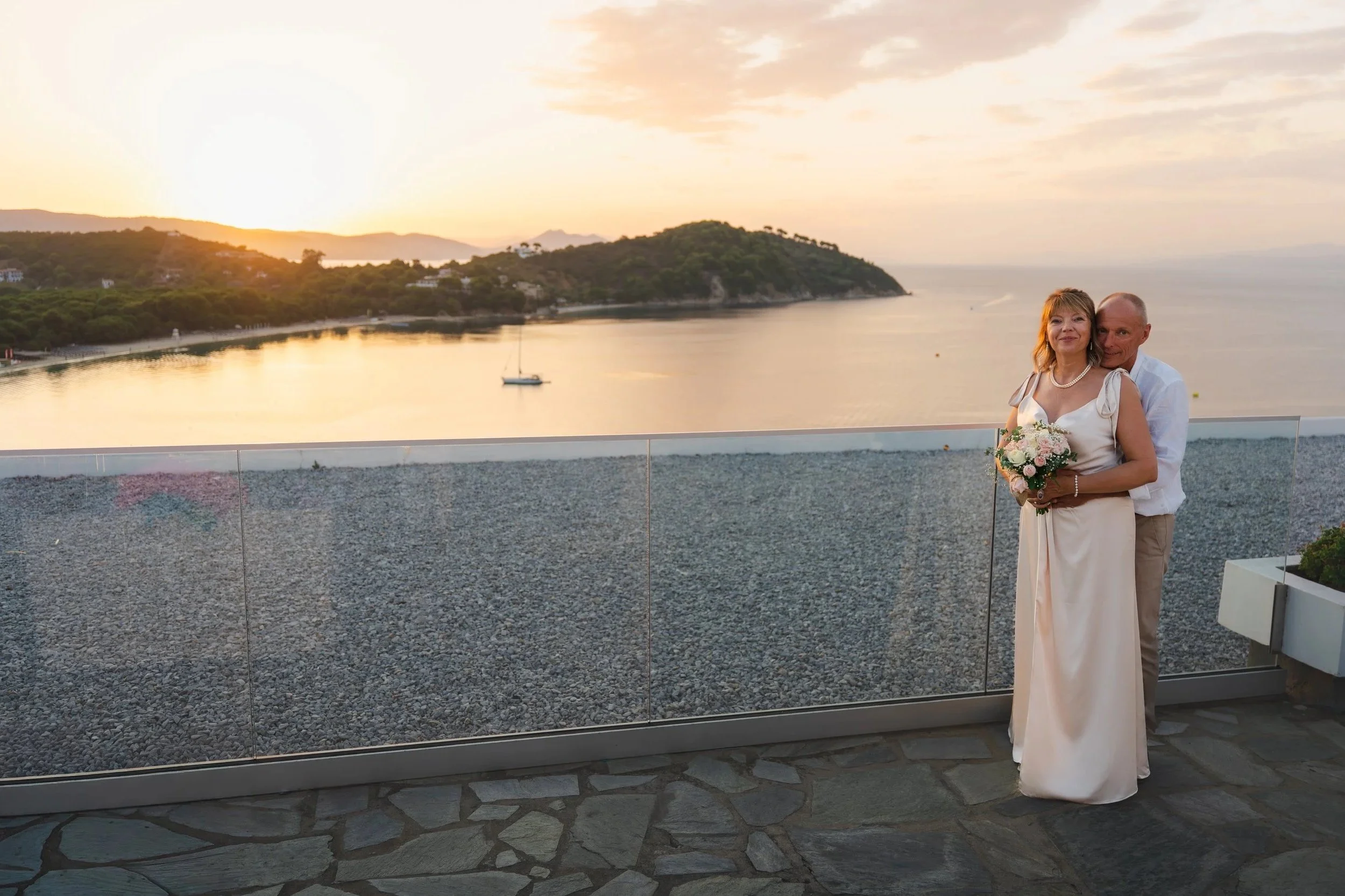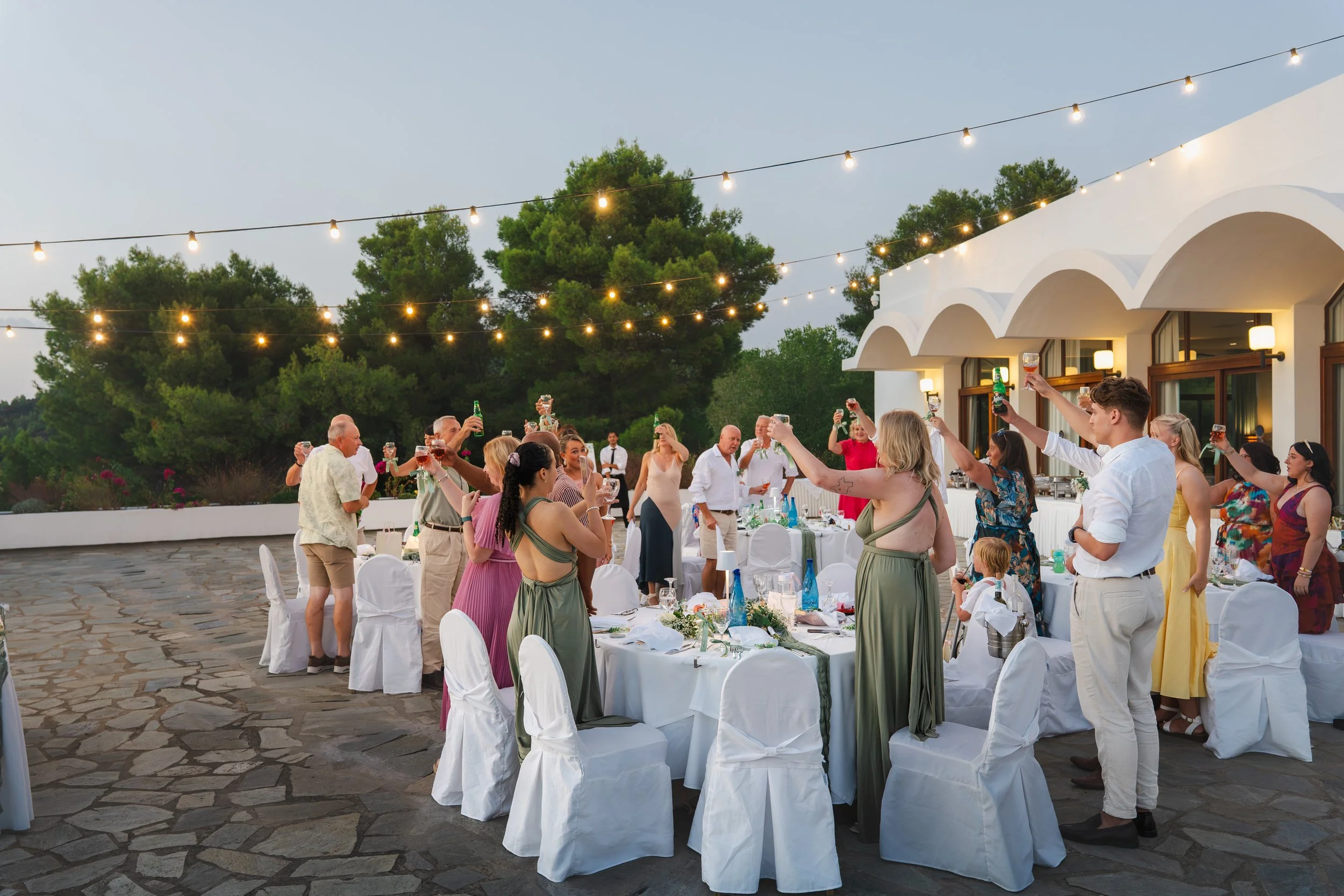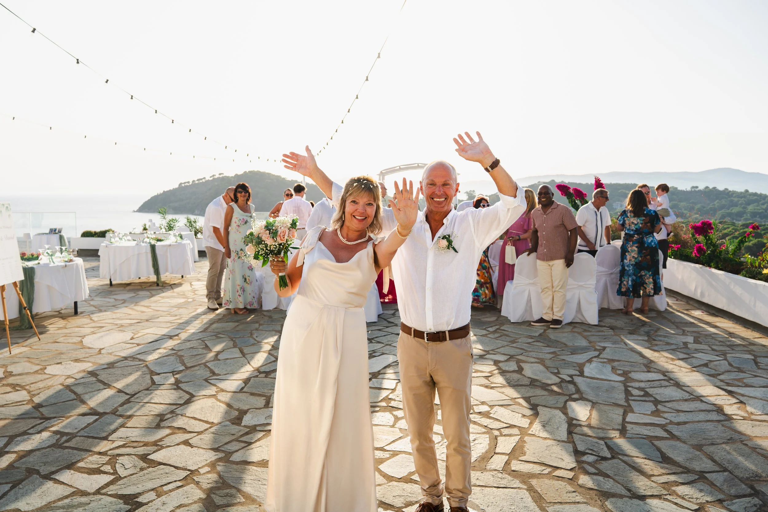 Our ceremony took place outdoors overlooking the beautiful bay of Koukounaries Beach, with the mountains rising behind us and the sun setting perfectly as we said “I do.”